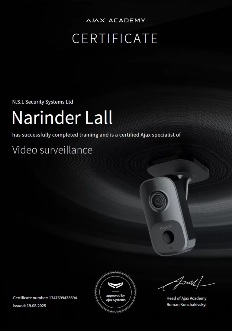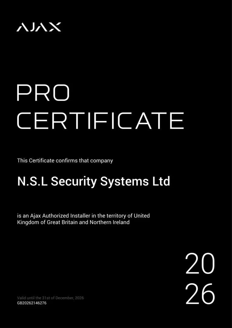 N.S.L Security Systems Ltd is a certified Ajax Authorised Systems Installer in the United Kingdom. This accreditation confirms that our engineers have completed manufacturer-approved training and are authorised to install and commission Ajax security systems to Ajax standards.